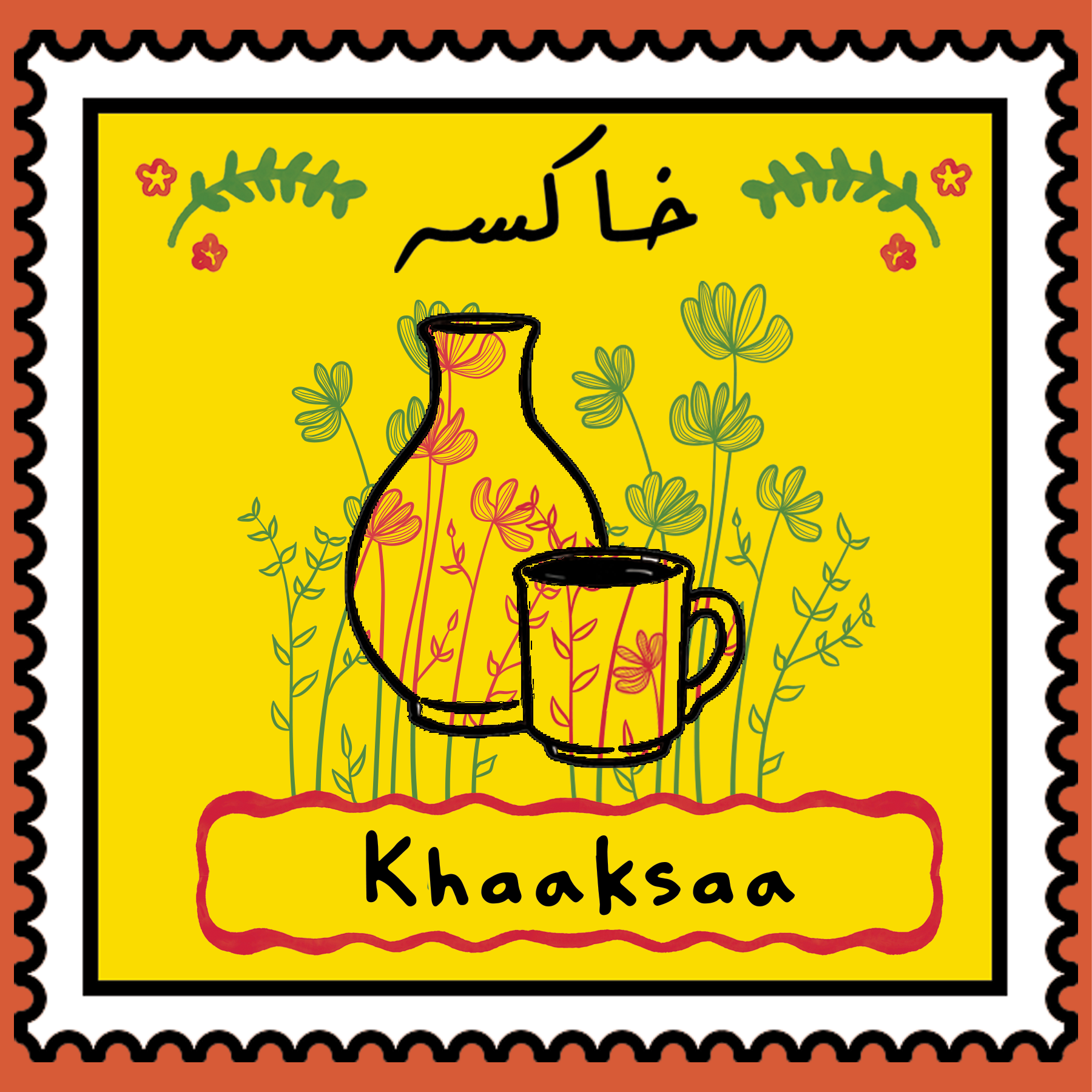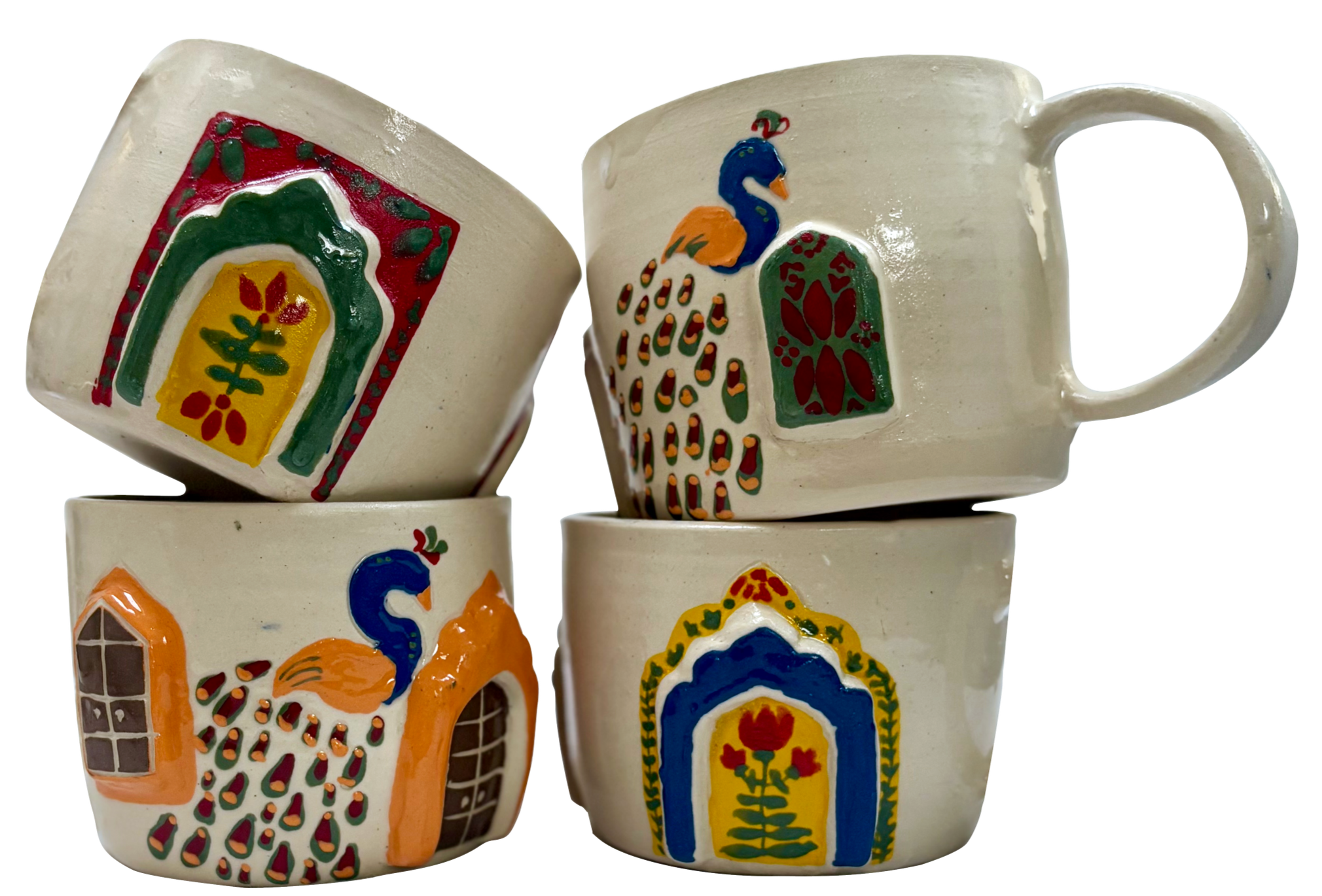 The cup is made of white stoneware clay, and is handmade and hand painted. The design of the cup is inspired by traditional South Asian doors and arches, and peacocks - a bird that is a feature in South Asian poetry, gardens and holds a special place in history.